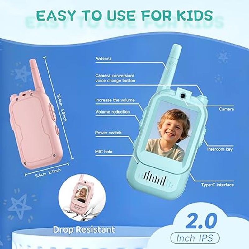 • [Upgraded Video Intercom]: Different with traditional walkie-talkies that only transmit sound, our walkie talkies have added video function, which allows kids to have video calls with each other, achieving truly barrier-free communication and adding more fun in kids activities.